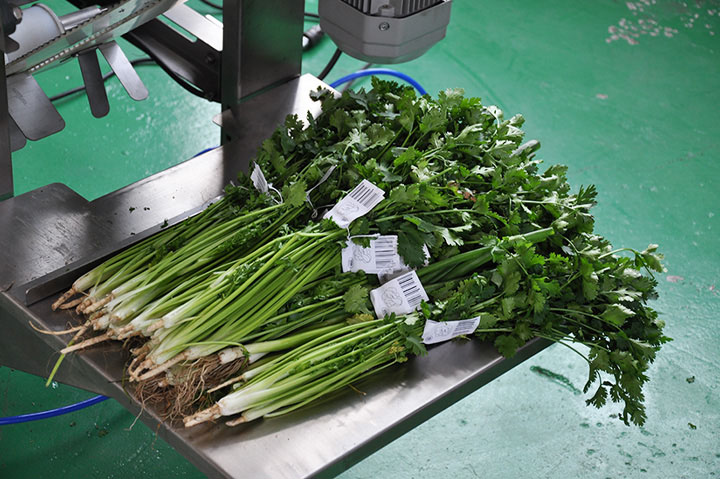 適合于大型商超配送中心、蔬菜種植基地等單位,采用彈力繩扎捆技術,可一次完成切根、掛標、扎捆等,不傷菜、無污染,效率達1800束/小時,能節省大量人工。