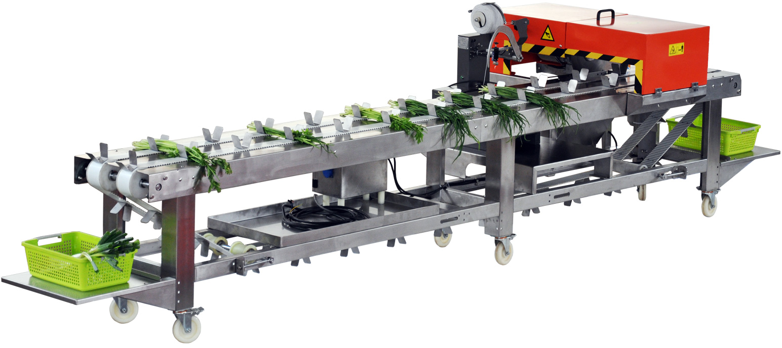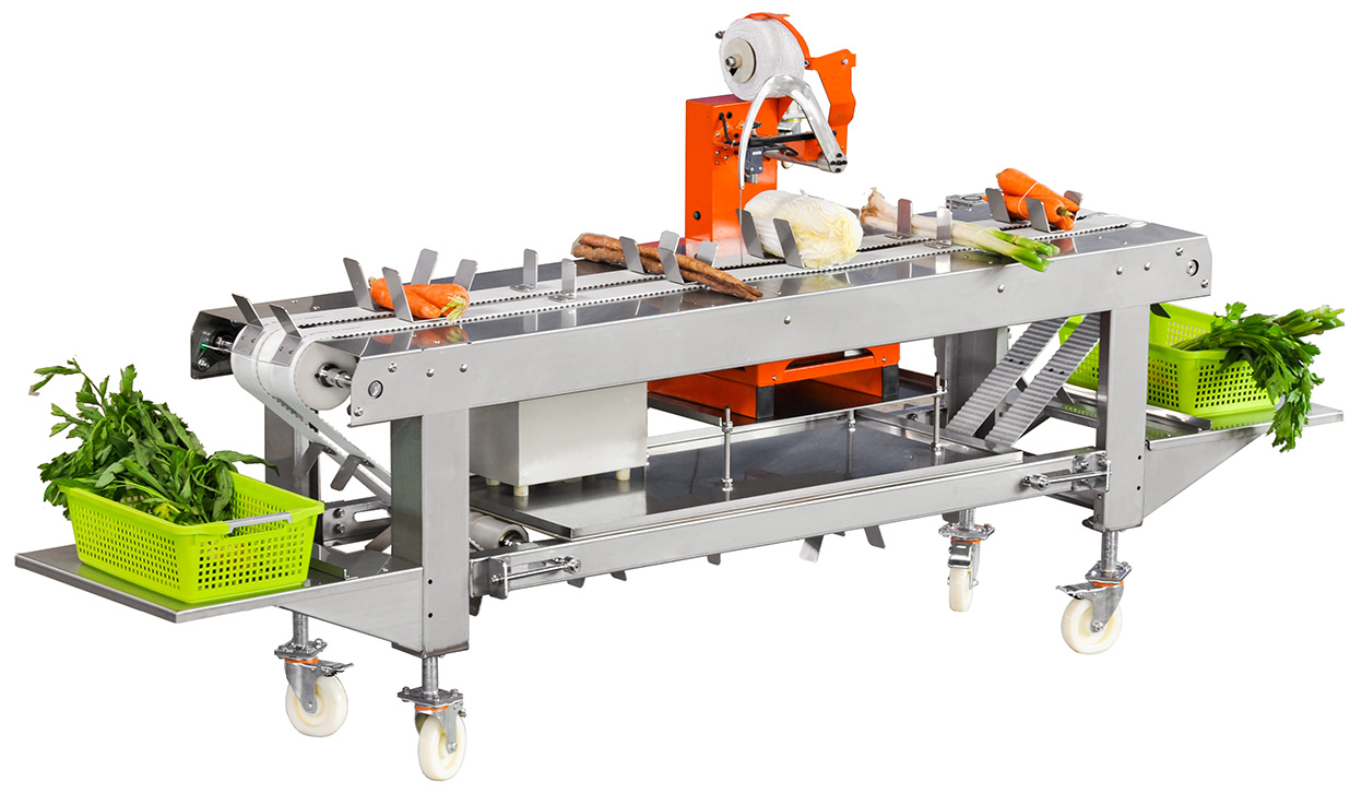 適合于大型商超配送中心、蔬菜種植基地等單位,采用彈力繩扎捆技術,可一次完成切根、掛標、扎捆等,不傷菜、無污染,效率達1800束/小時,能節省大量人工。