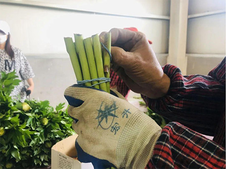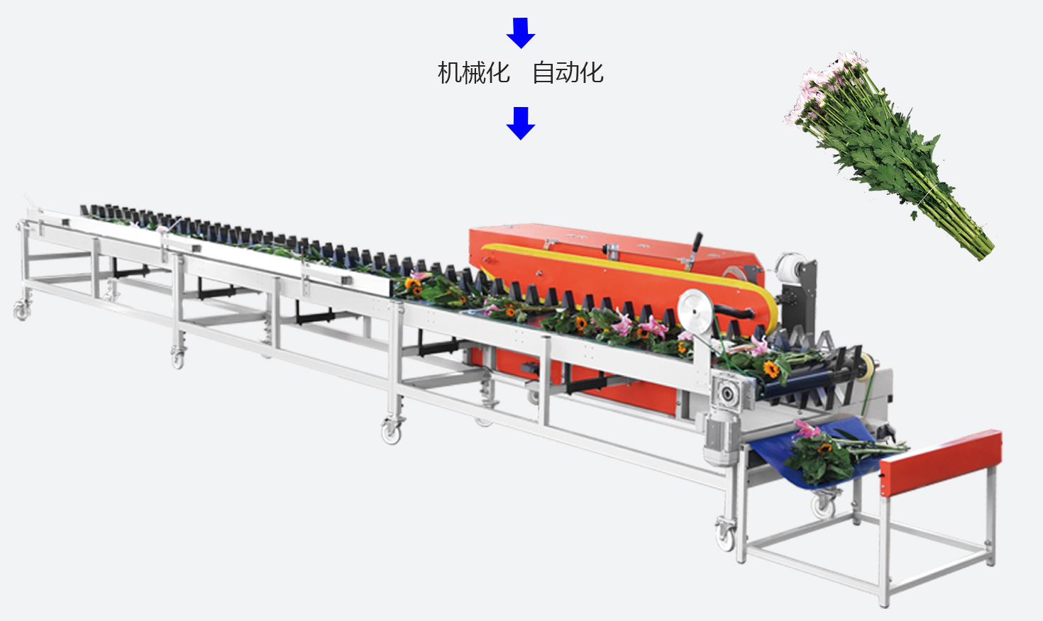 鮮切花整理扎捆線,一次完成切根、梳葉、打刺、扎捆等工序,采用彈力繩扎捆技術,效率達3600束/小時。適合鮮切花生產和批發企業,節省大量人工。